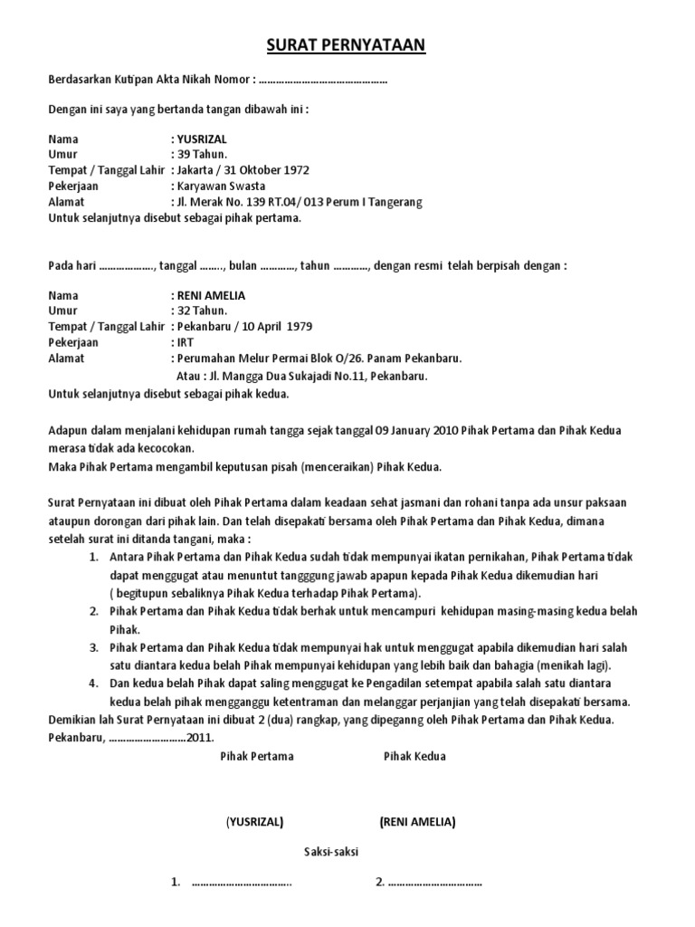 Rizki bin barokah umur : Semoga dapat memberikan manfaat yang berharga bagi. Kami yang bertandatangan di bawah ini: Tujuannya adalah agar tidak merugikan kedua belah pihak seandainya pernyataan yang disampaikan merupakan kebohongan atau tidak ditepati. Contoh cerai nikah untuk istri.